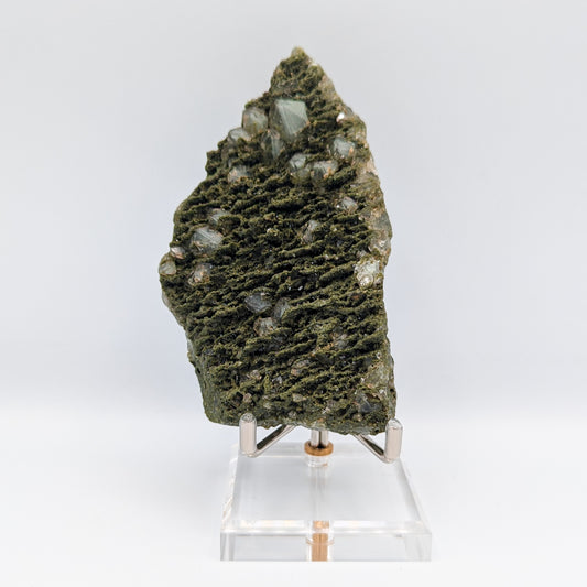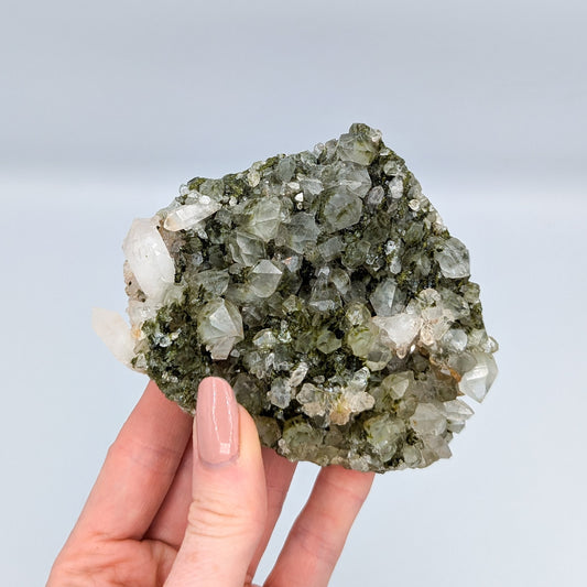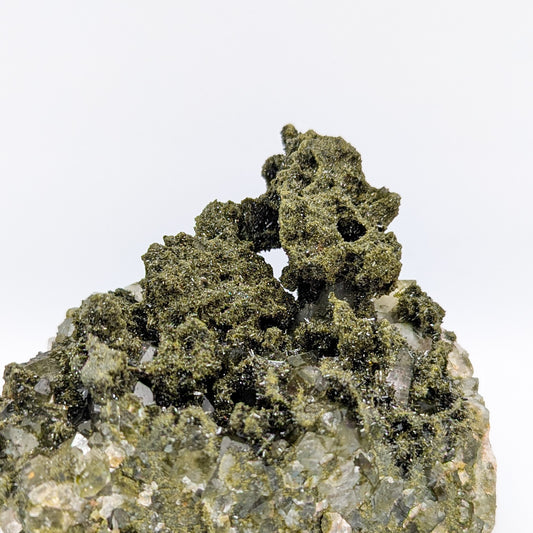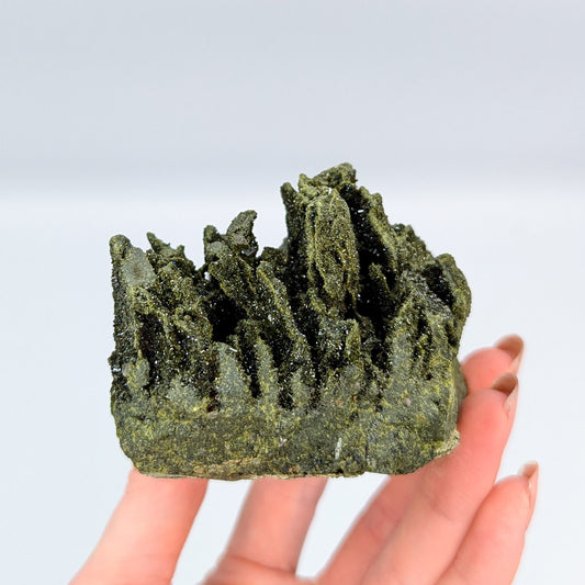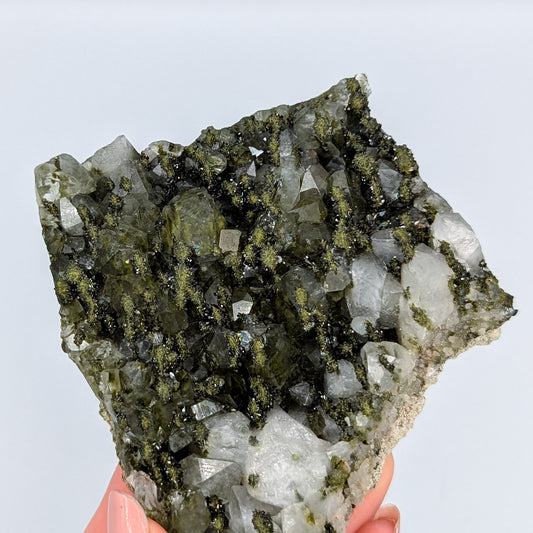 "Forest Quartz" has become the name given to this visual beauty of a specimen, the combination of Epidote growing on Quartz clusters. This incredible harmony is only found in one locality in the world, making it that much more desirable, beyond the physical impression of it. Epidote radiates an energy of growth. It helps to draw us out of negative slumps, and inspires us to take on the world.
