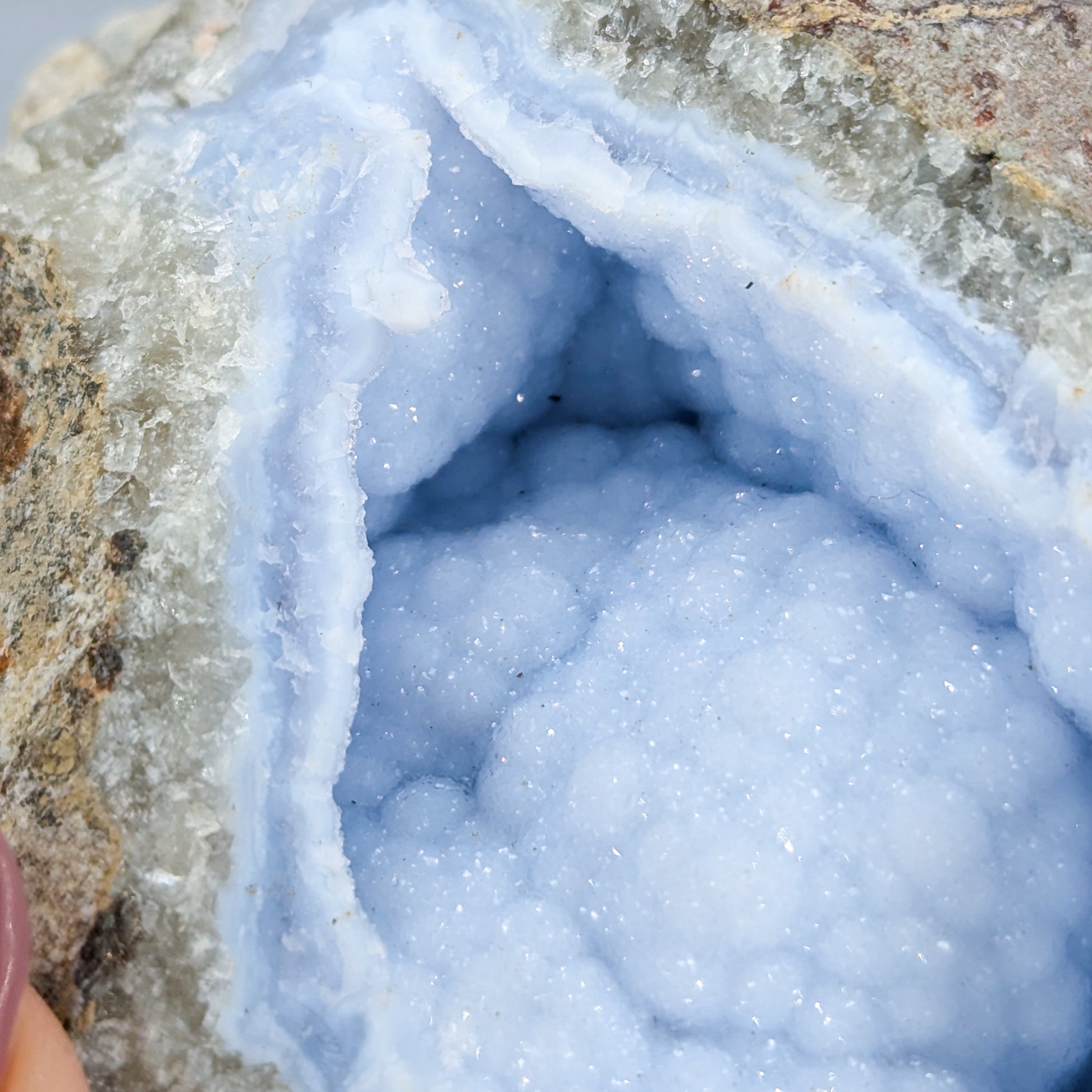 Blue Lace Agate is a beautiful variation of the Agate family. Its energy is slow and steady, working over time to change habits and filter in its positive vibrations. Blue Lace Agate is deeply rooted in the Throat Chakra, aiding in opening one's ability to speak their highest truth. It is a stone of gentle transformation, emphasizing the importance of clear and steady communication. It is the perfect companion for those working with affirmations. It amplifies the words we speak, and connects deeply with the ripples under the surface that perhaps are holding us back. As an agate, it may not be an overnight transition, but time and purposely spoken words are key to stepping into the next level of truth within.
