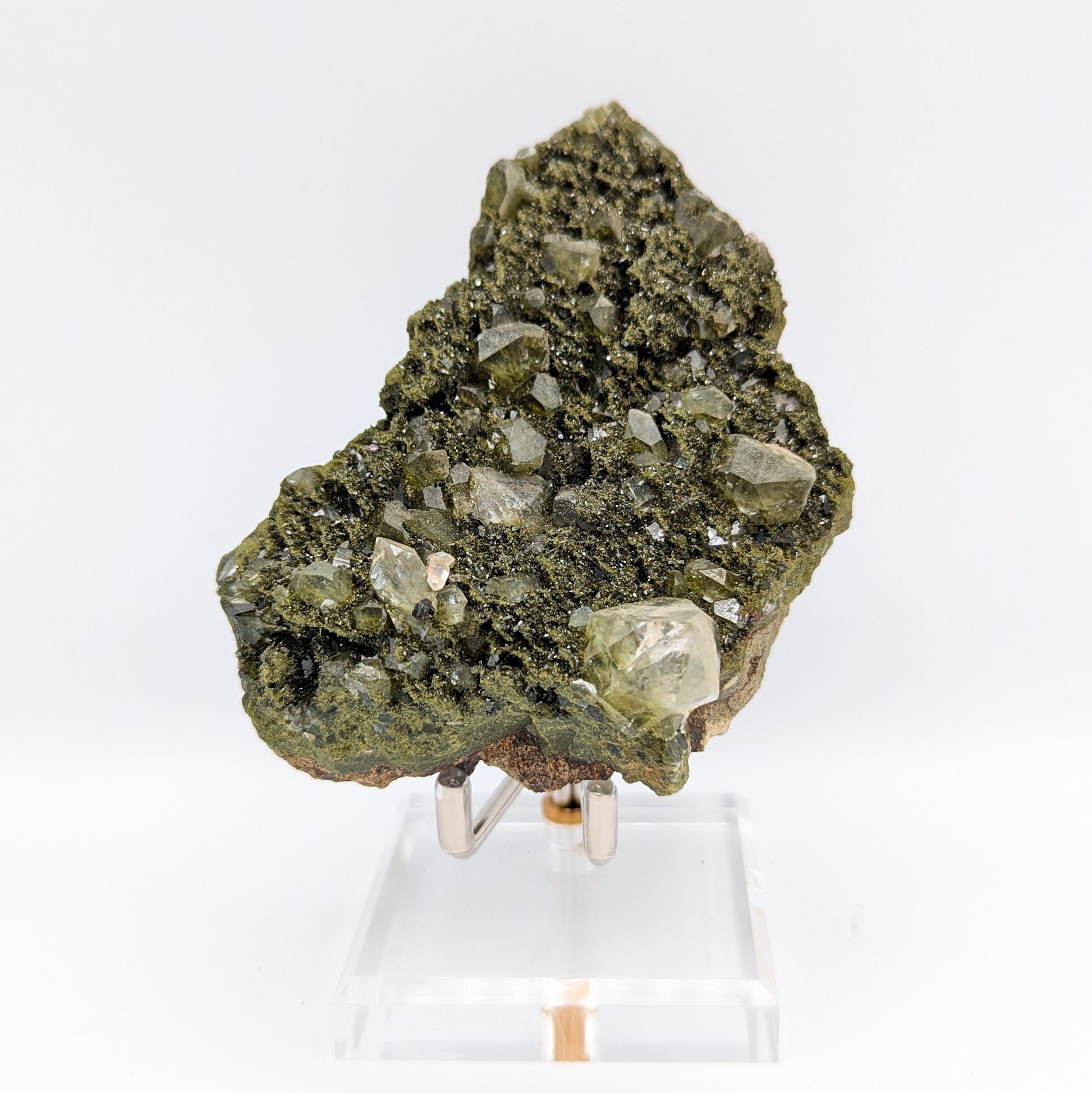 "Forest Quartz" has become the name given to this visual beauty of a specimen, the combination of Epidote growing on Quartz clusters. This incredible harmony is only found in one locality in the world, making it that much more desirable, beyond the physical impression of it. These pieces have a wonderful mixture of mature Epidote crystals (deeper green colour and larger crystalline structure), and younger Epidote crystals (brighter green and very subtle crystalline structure). Looking at these pieces will transport you to another world of deep green forests, and crystal clear waters. Stunning.