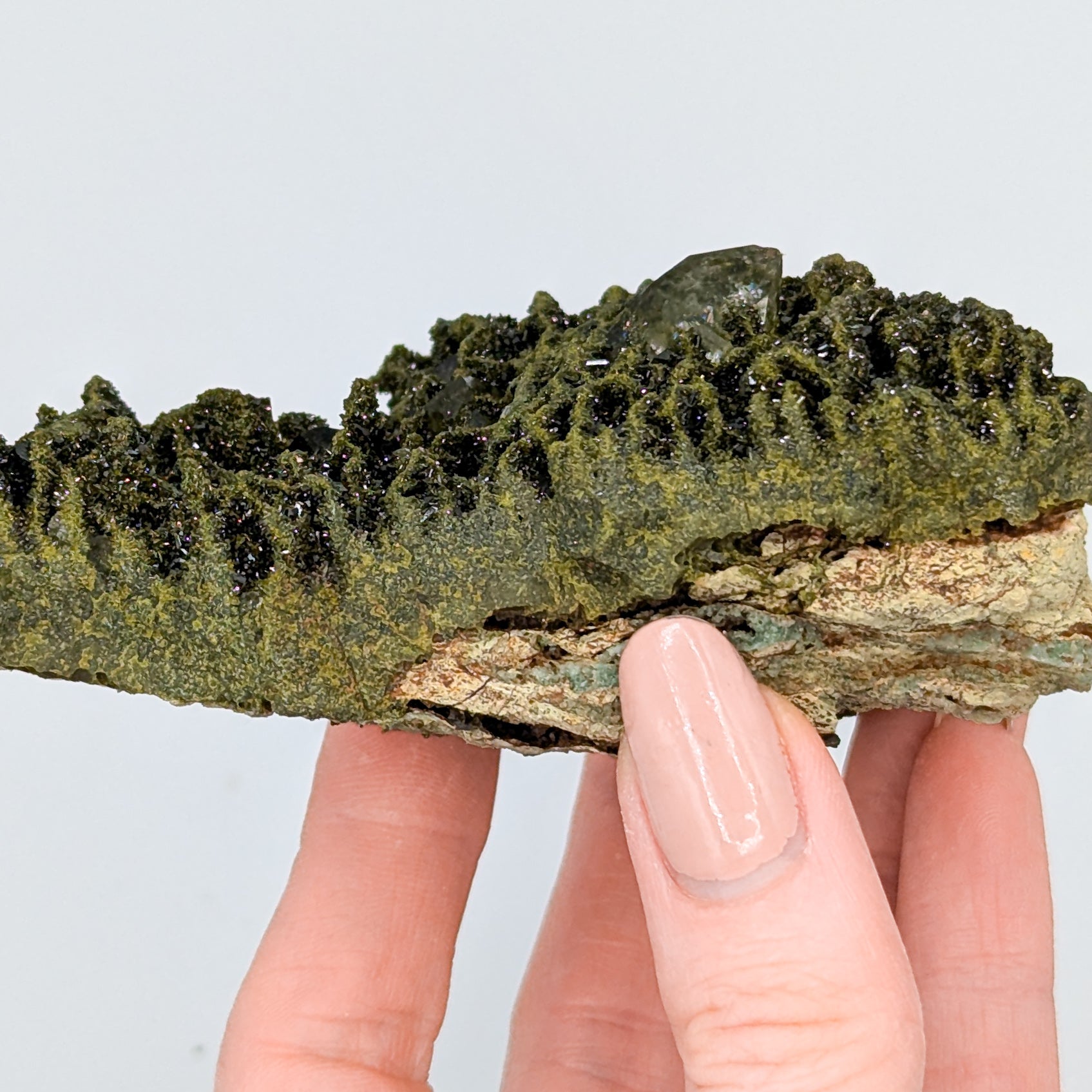 "Forest Quartz" has become the name given to this visual beauty of a specimen, the combination of Epidote growing on Quartz clusters. This incredible harmony is only found in one locality in the world, making it that much more desirable, beyond the physical impression of it. These pieces have a wonderful mixture of mature Epidote crystals (deeper green colour and larger crystalline structure), and younger Epidote crystals (brighter green and very subtle crystalline structure). Looking at these pieces will transport you to another world of deep green forests, and crystal clear waters. Stunning.