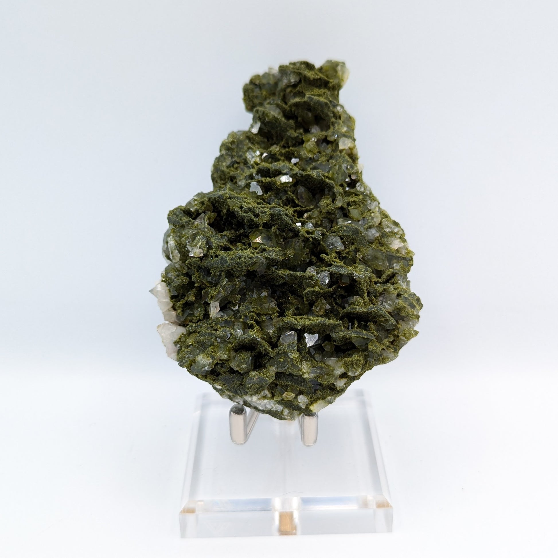 "Forest Quartz" has become the name given to this visual beauty of a specimen, the combination of Epidote growing on Quartz clusters. This incredible harmony is only found in one locality in the world, making it that much more desirable, beyond the physical impression of it. These pieces have a wonderful mixture of mature Epidote crystals (deeper green colour and larger crystalline structure), and younger Epidote crystals (brighter green and very subtle crystalline structure). Looking at these pieces will transport you to another world of deep green forests, and crystal clear waters. Stunning.