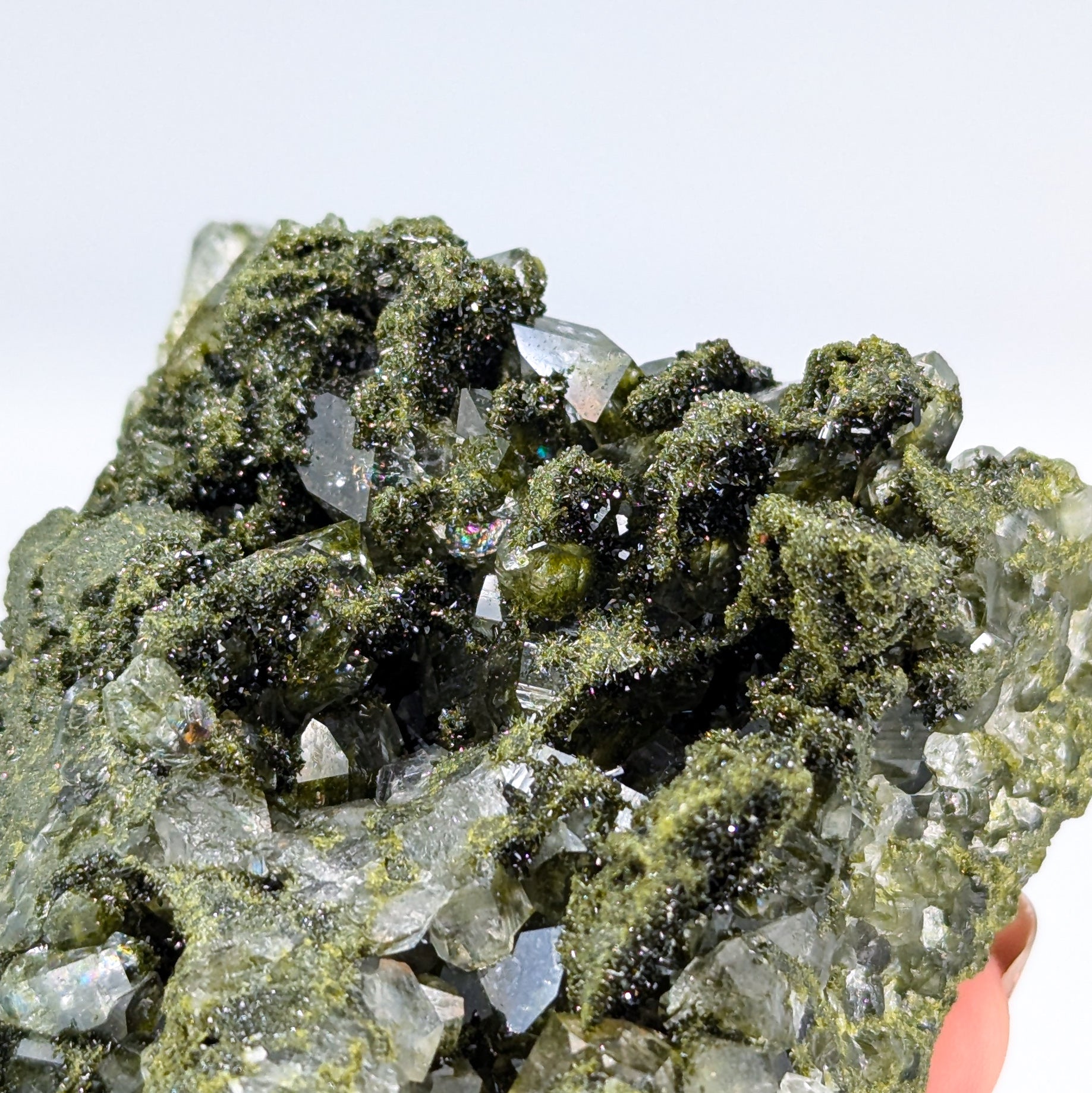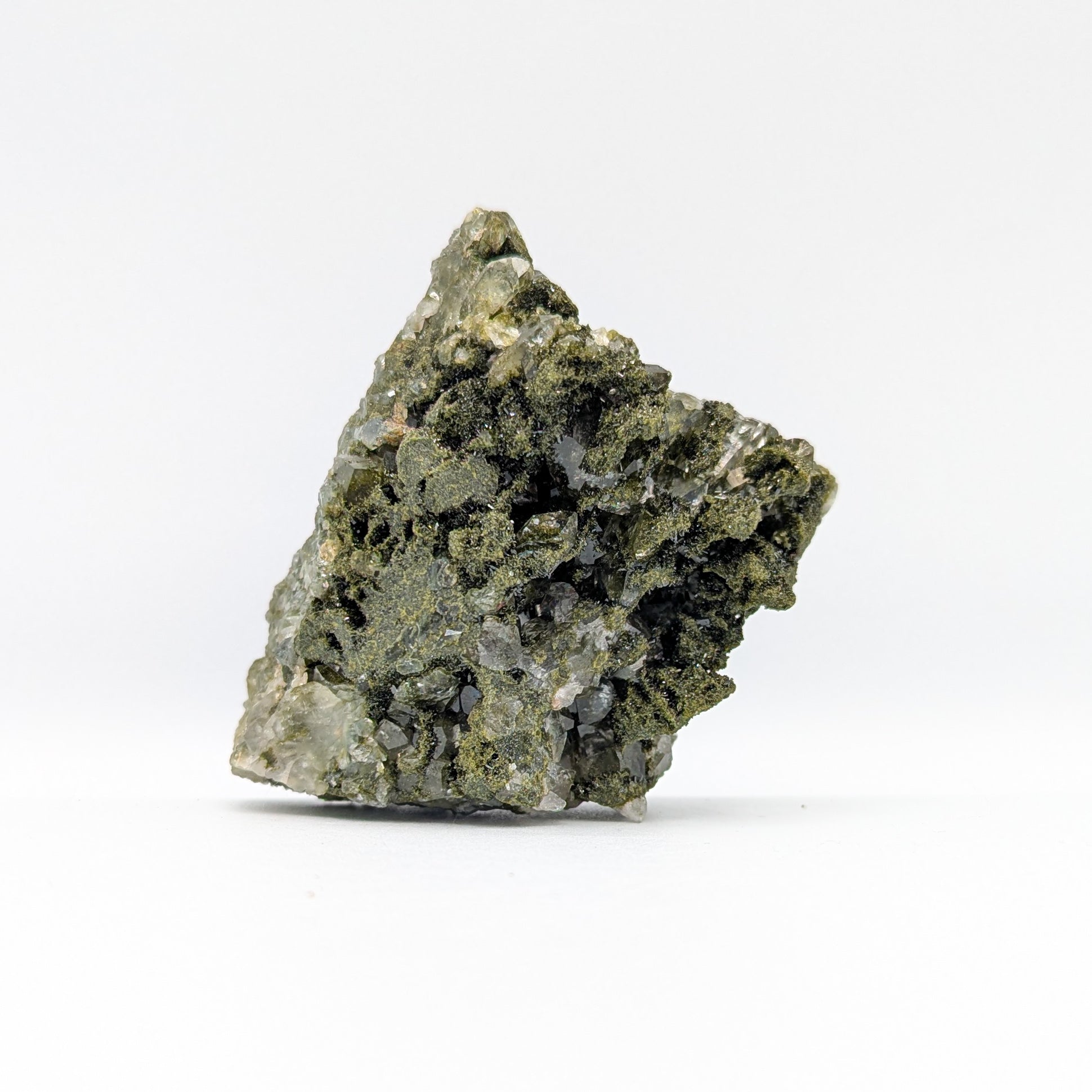 "Forest Quartz" has become the name given to this visual beauty of a specimen, the combination of Epidote growing on Quartz clusters. This incredible harmony is only found in one locality in the world, making it that much more desirable, beyond the physical impression of it. These pieces have a wonderful mixture of mature Epidote crystals (deeper green colour and larger crystalline structure), and younger Epidote crystals (brighter green and very subtle crystalline structure). Looking at these pieces will transport you to another world of deep green forests, and crystal clear waters. Stunning.