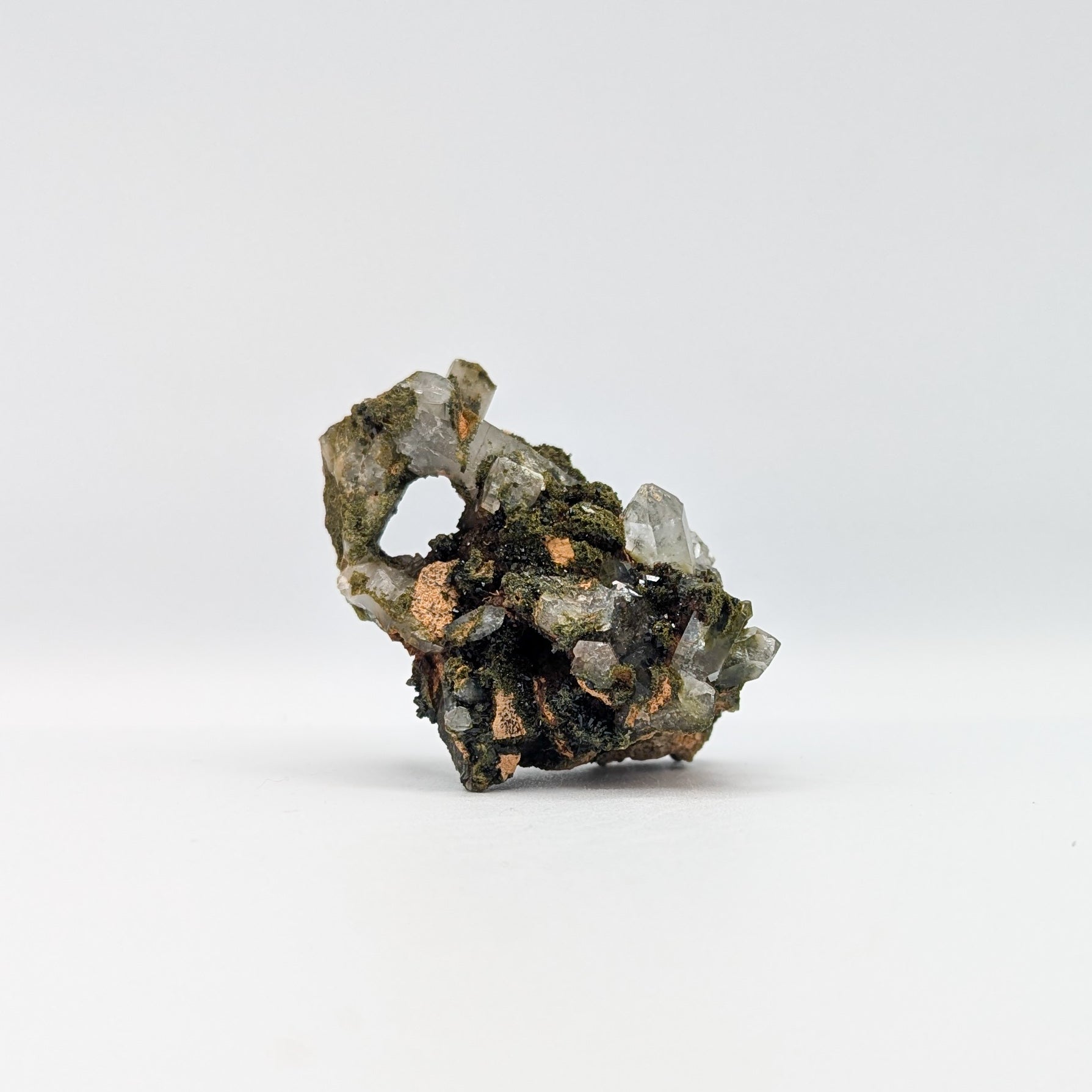 "Forest Quartz" has become the name given to this visual beauty of a specimen, the combination of Epidote growing on Quartz clusters. This incredible harmony is only found in one locality in the world, making it that much more desirable, beyond the physical impression of it. These pieces have a wonderful mixture of mature Epidote crystals (deeper green colour and larger crystalline structure), and younger Epidote crystals (brighter green and very subtle crystalline structure). Looking at these pieces will transport you to another world of deep green forests, and crystal clear waters. Stunning.