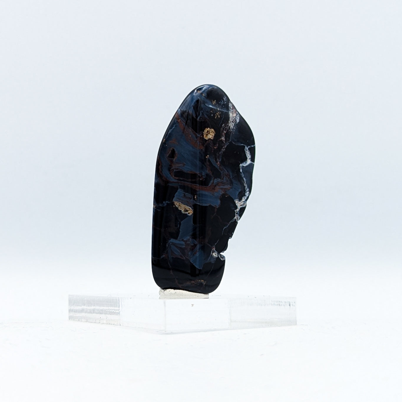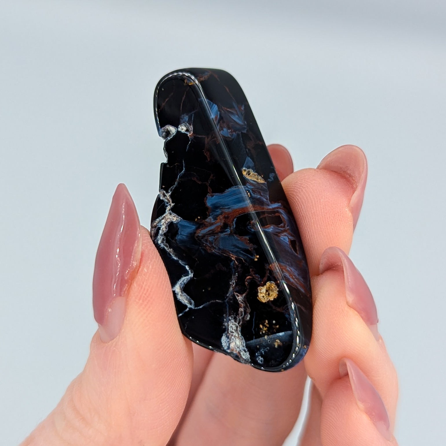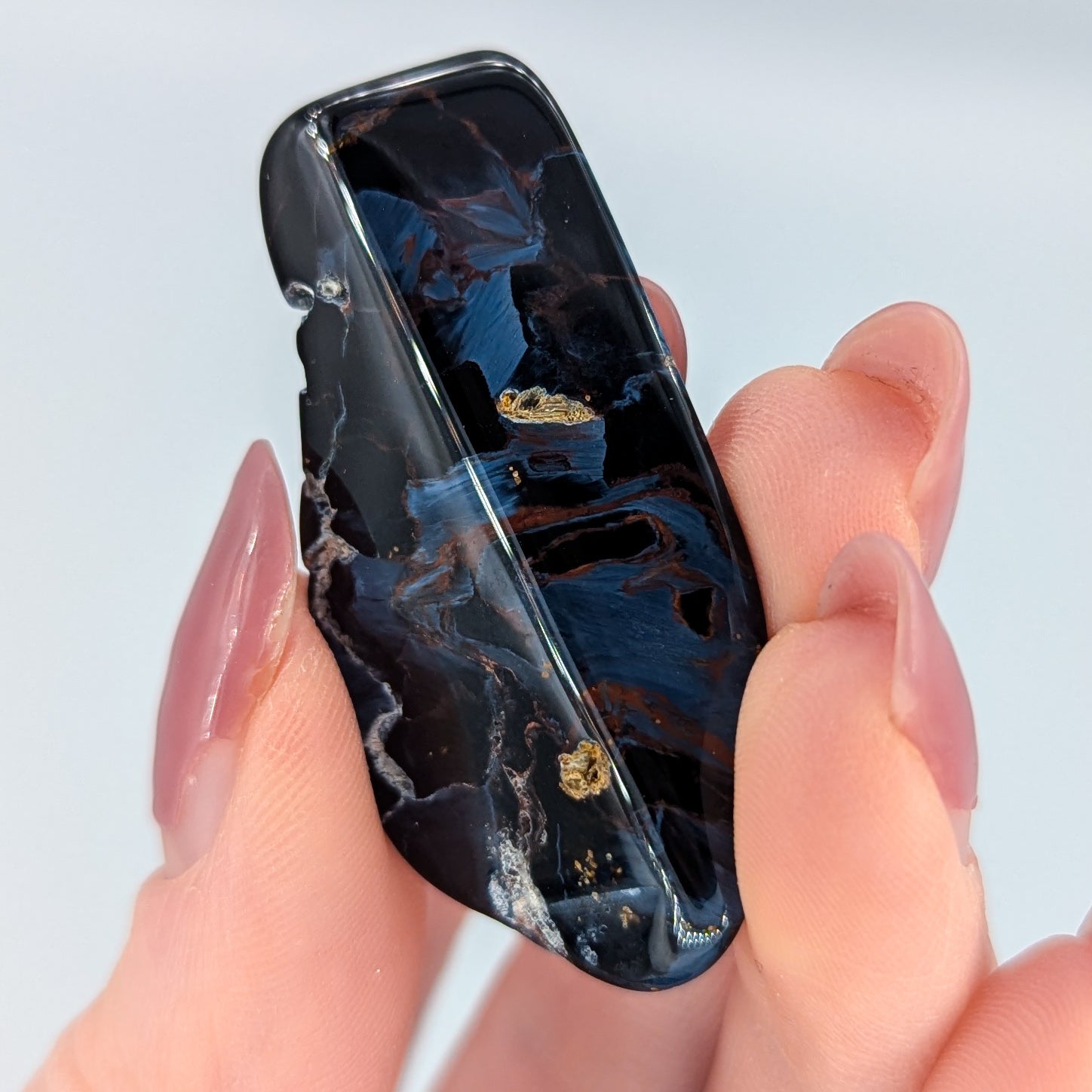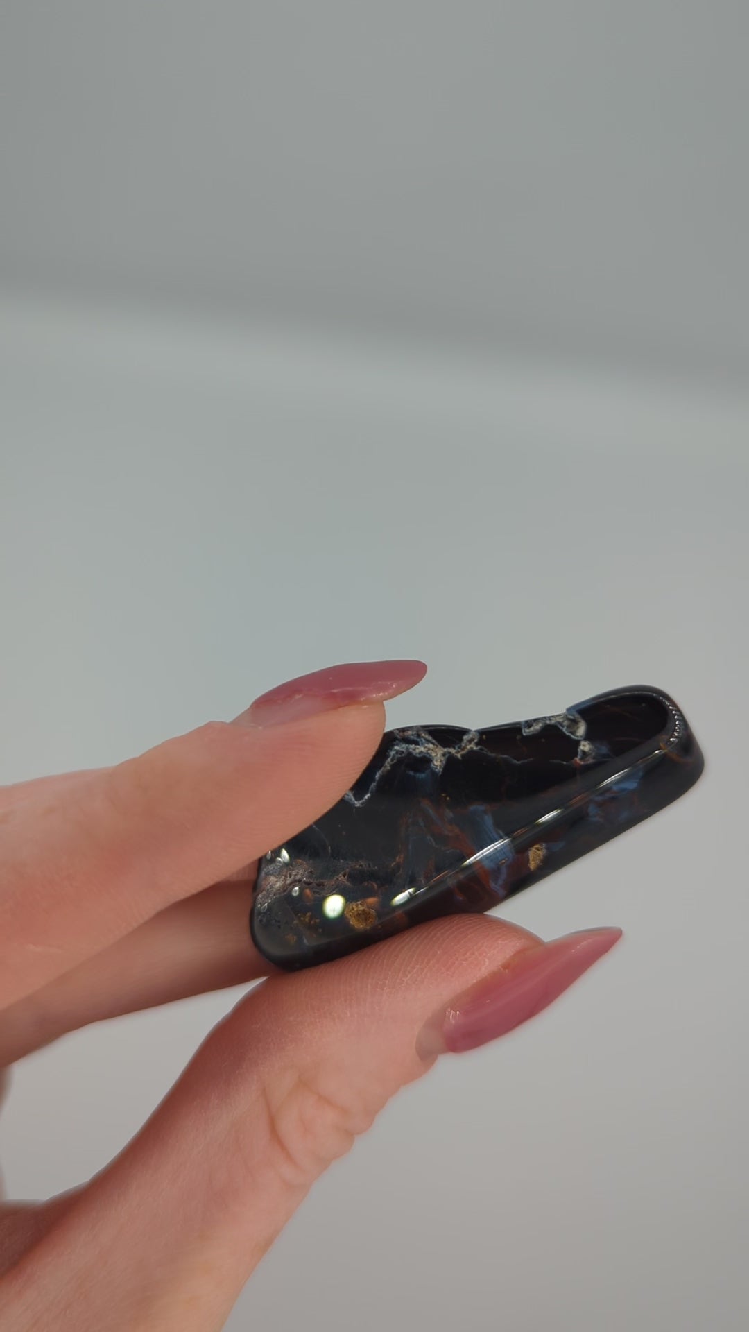 Pietersite is a rare chalcedony mineral, with flashes of chatoyancy, found in the veins of Jasper. It resembles Tigers Eye but is not in the same family. There is only 1 active mine left in the world and deposits are small.