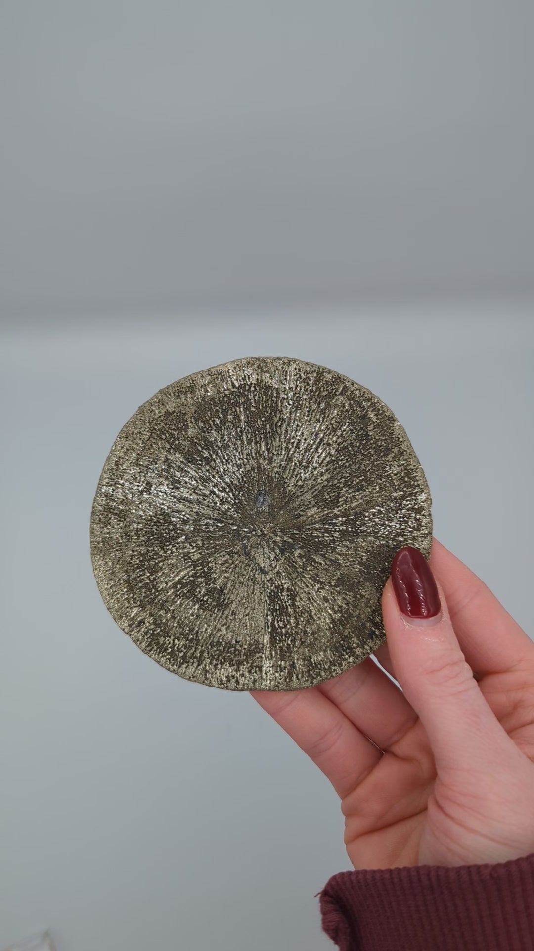 Pyrite Suns are a crystal structure that formed deep underground under enormous pressure about 350 million years ago. It is common to find these mineral disks about 300 feet below ground between seams of coal when coal is mined.