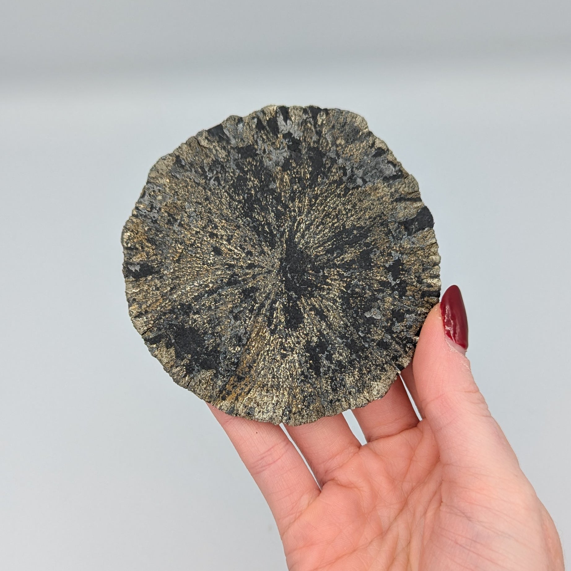 Pyrite Suns are a crystal structure that formed deep underground under enormous pressure about 350 million years ago. It is common to find these mineral disks about 300 feet below ground between seams of coal when coal is mined.