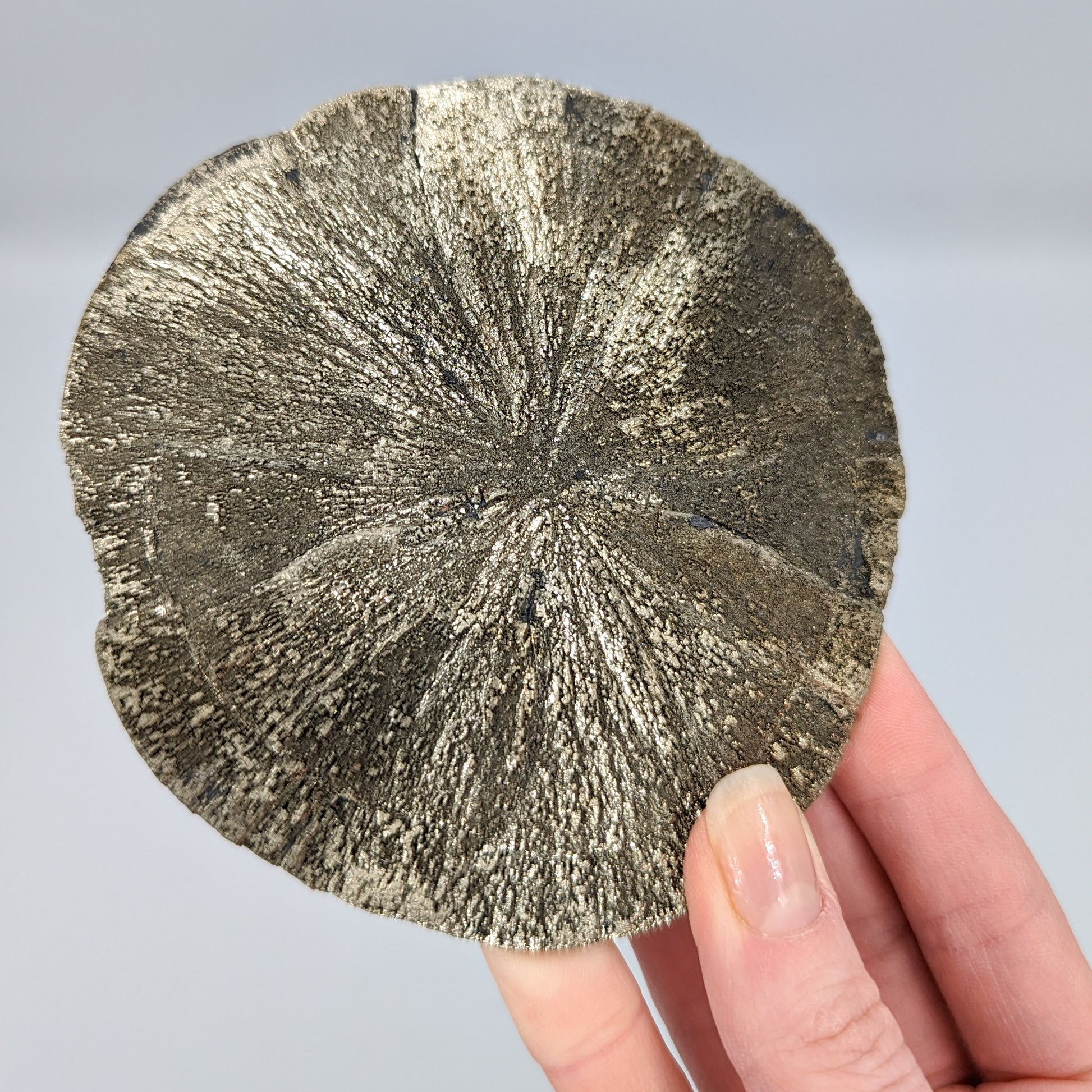 Pyrite Suns are a crystal structure that formed deep underground under enormous pressure about 350 million years ago. It is common to find these mineral disks about 300 feet below ground between seams of coal when coal is mined.
