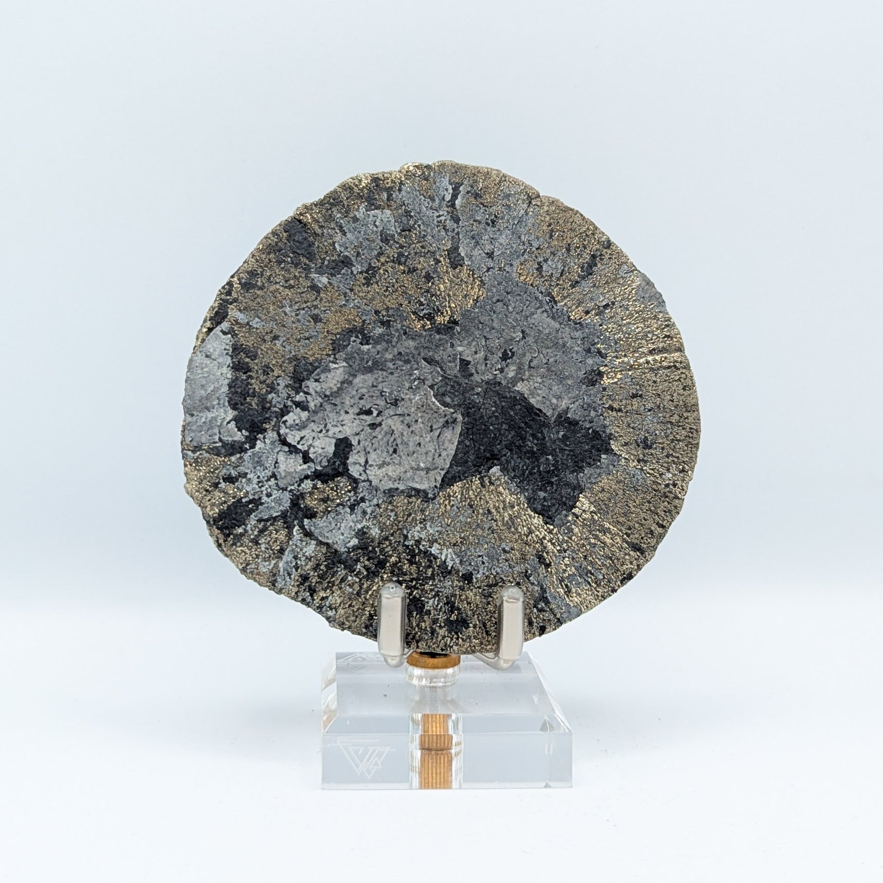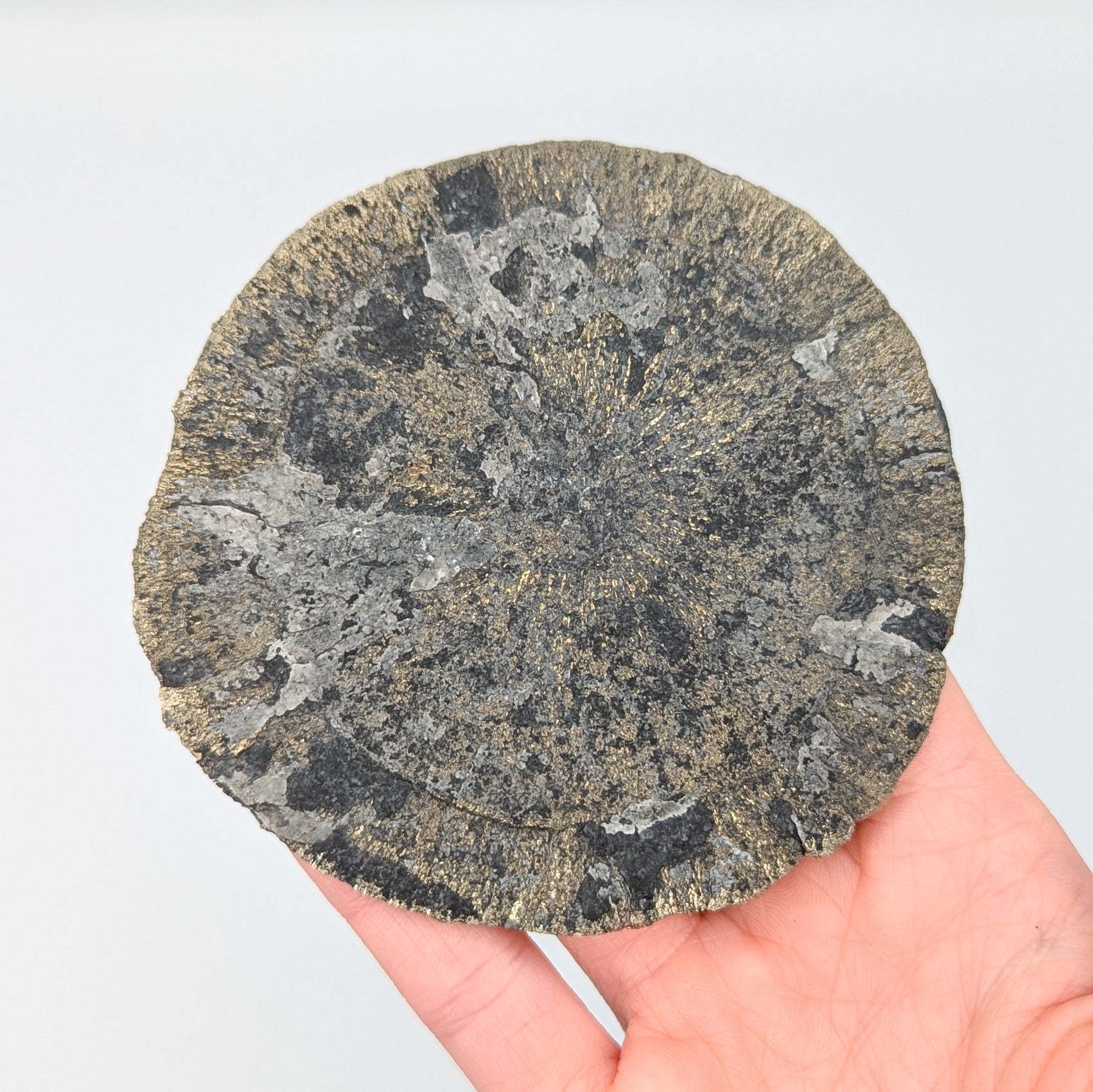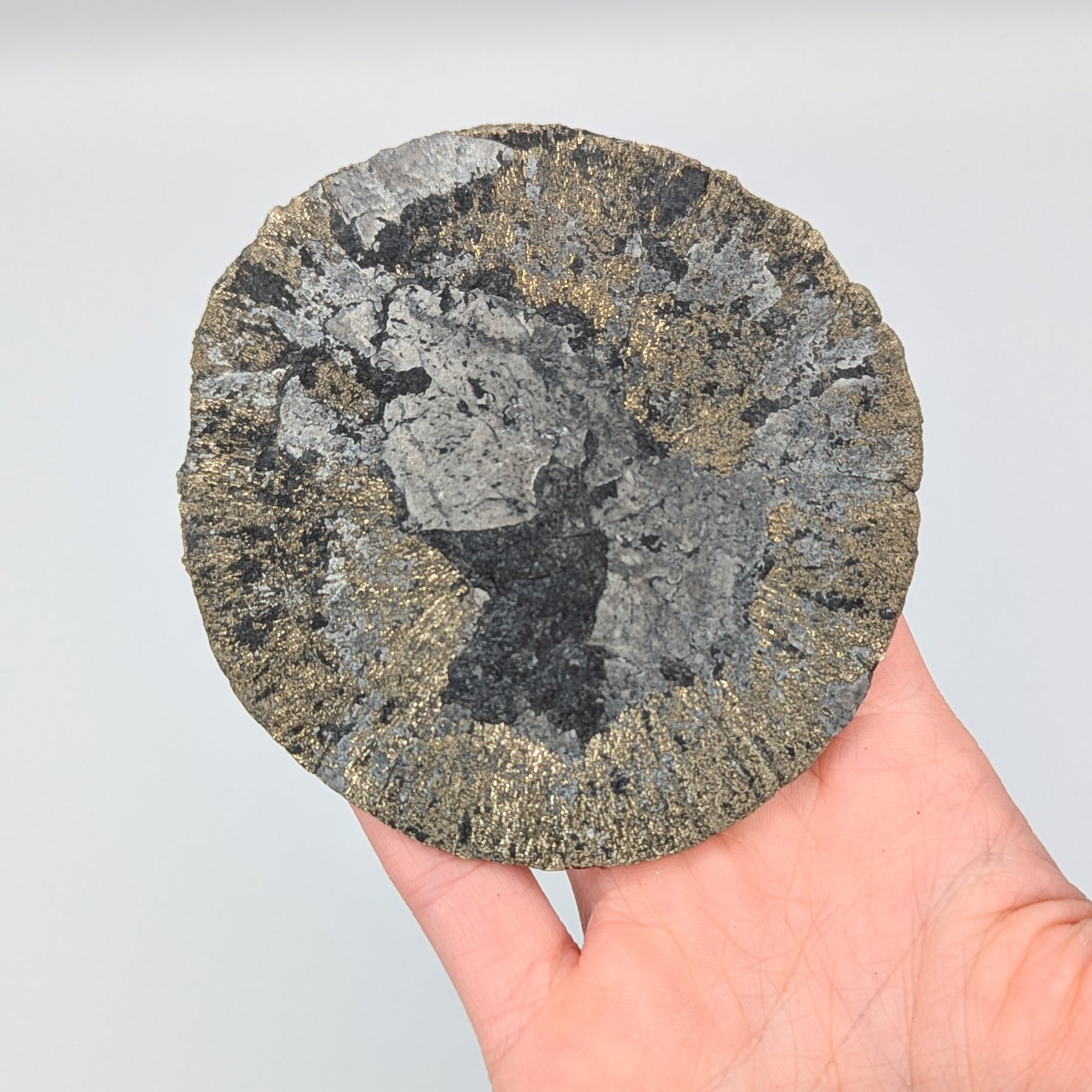 Pyrite Suns are a crystal structure that formed deep underground under enormous pressure about 350 million years ago. It is common to find these mineral disks about 300 feet below ground between seams of coal when coal is mined.