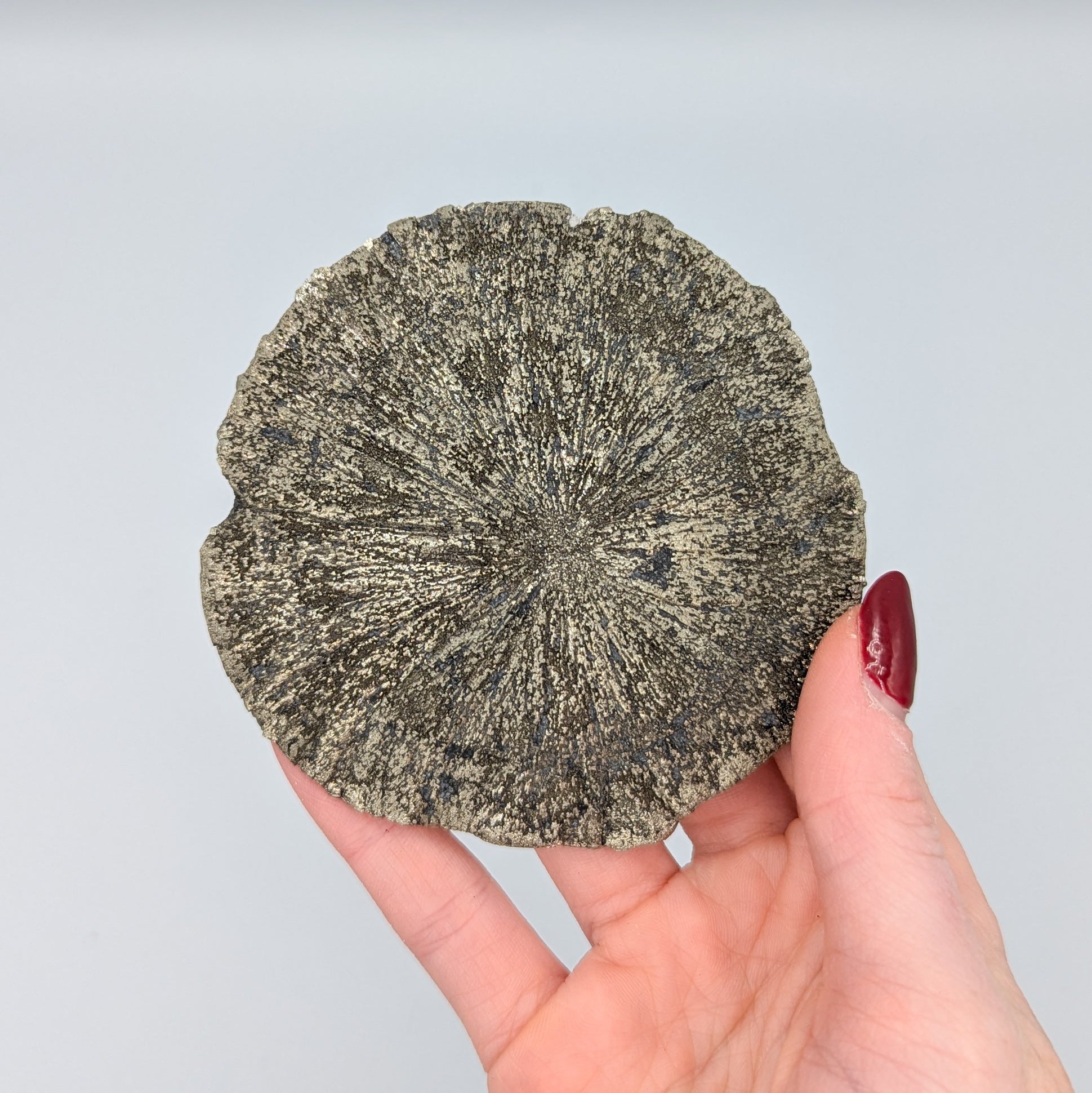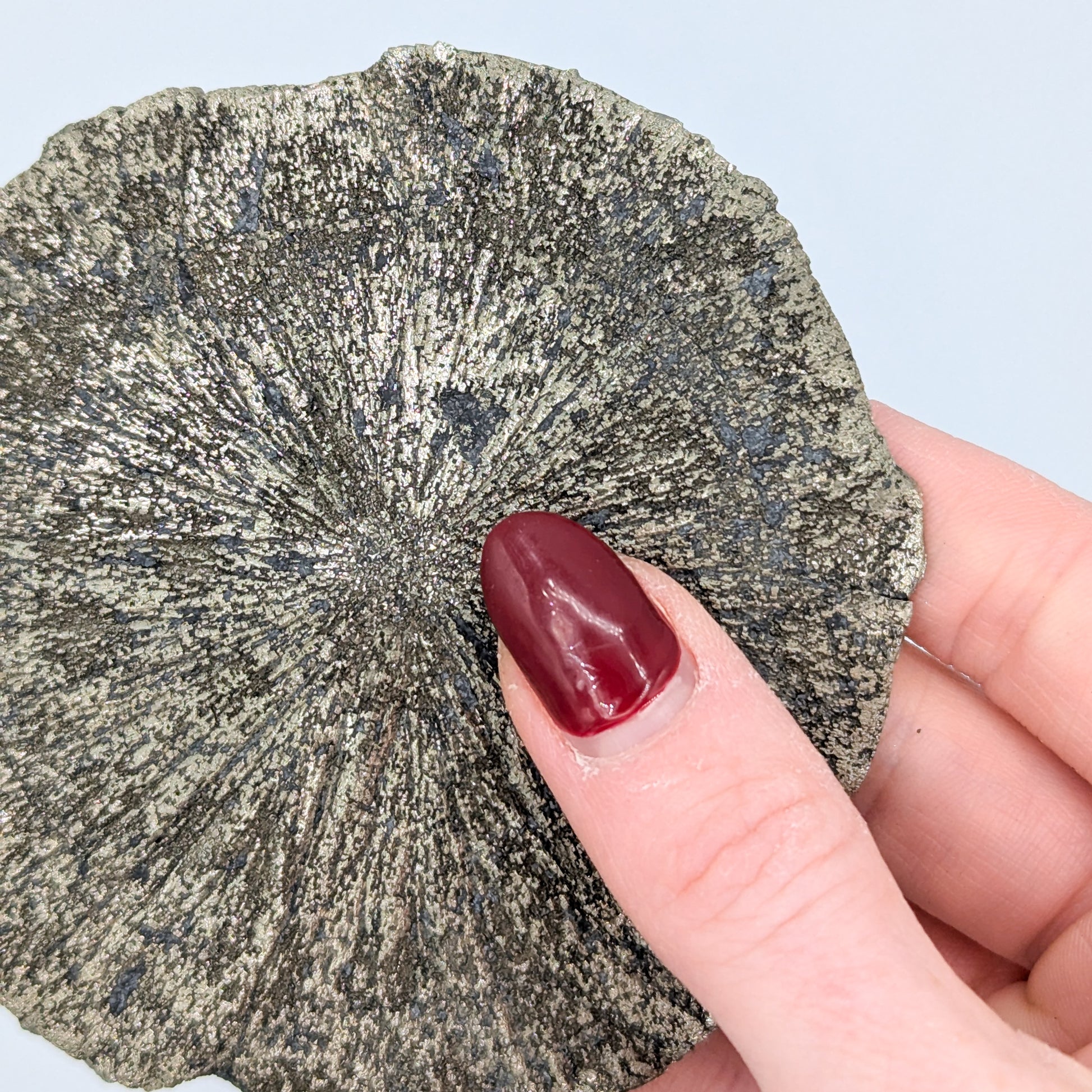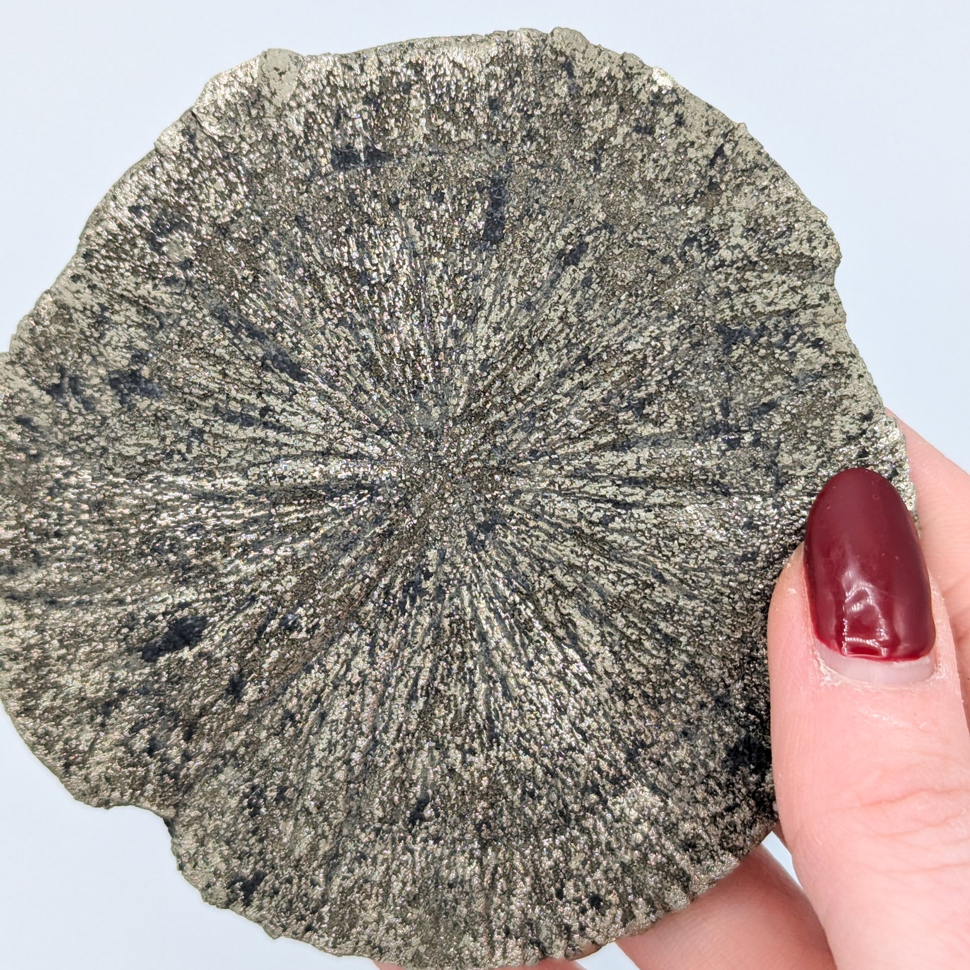 Pyrite Suns are a crystal structure that formed deep underground under enormous pressure about 350 million years ago. It is common to find these mineral disks about 300 feet below ground between seams of coal when coal is mined.