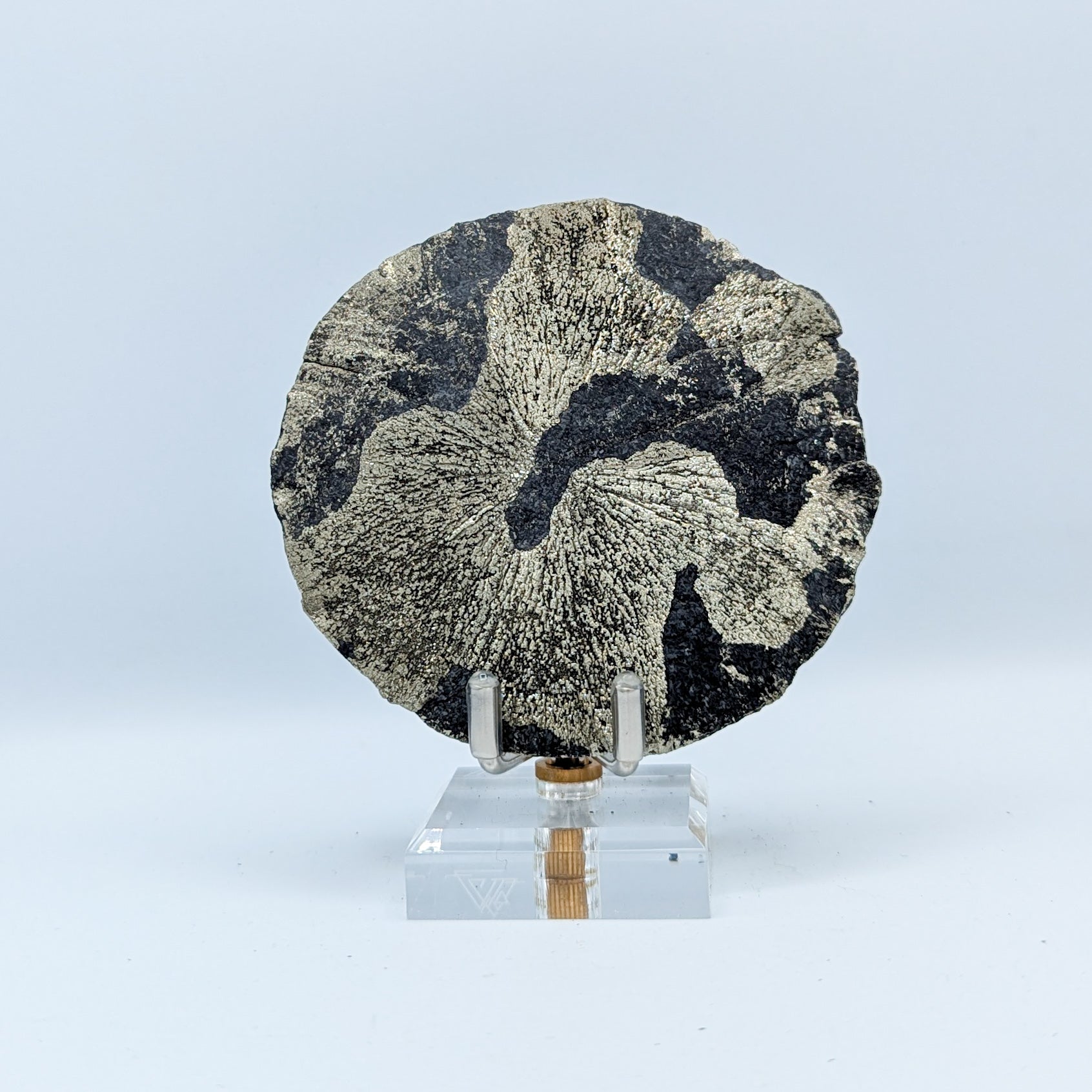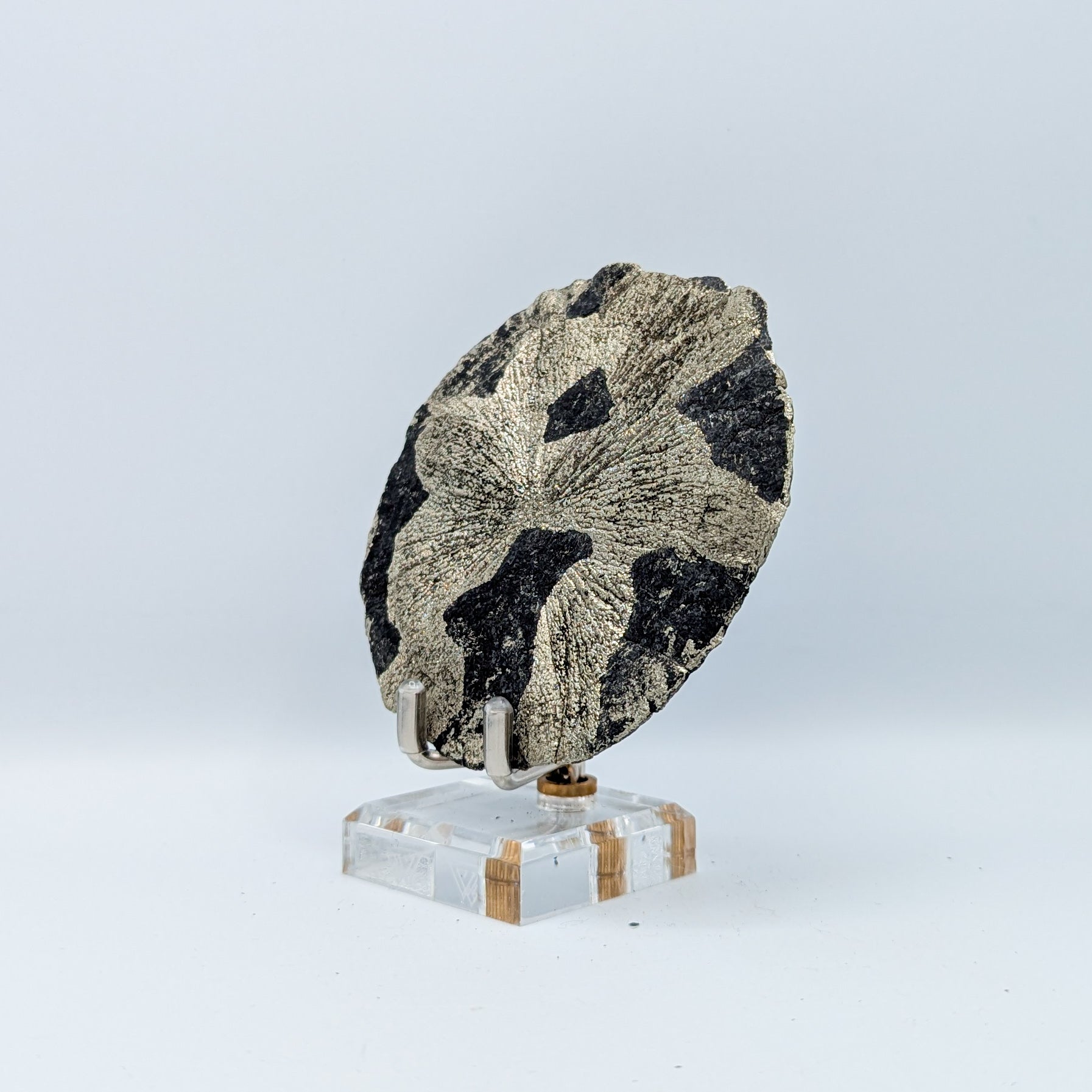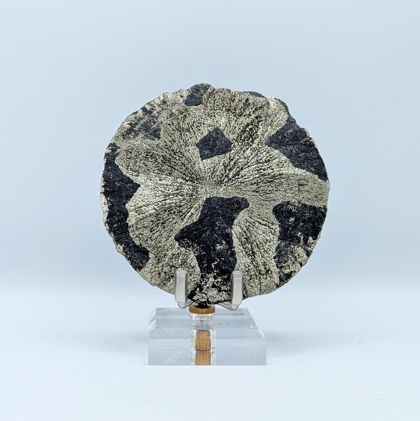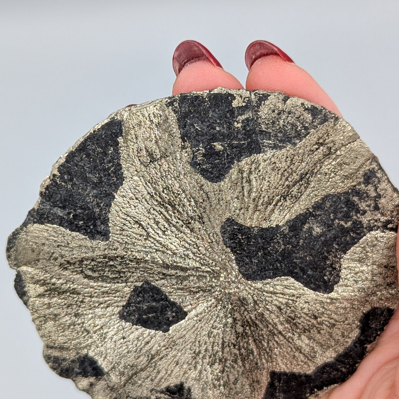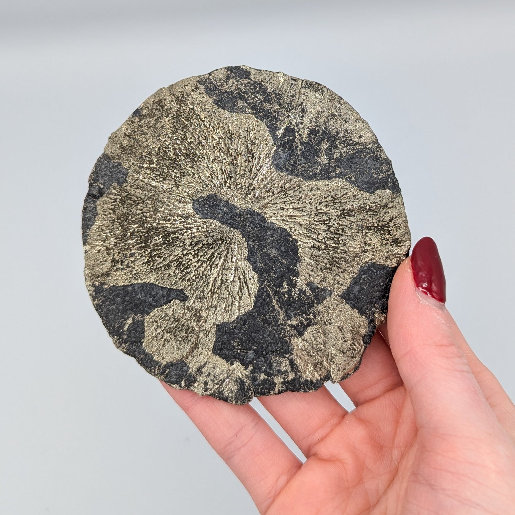 Pyrite Suns are a crystal structure that formed deep underground under enormous pressure about 350 million years ago. It is common to find these mineral disks about 300 feet below ground between seams of coal when coal is mined.