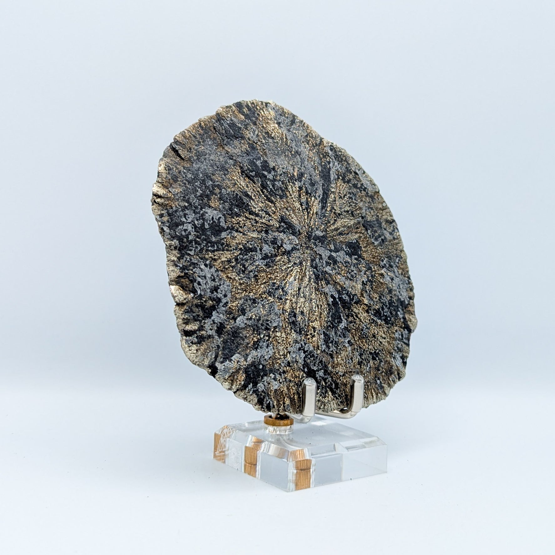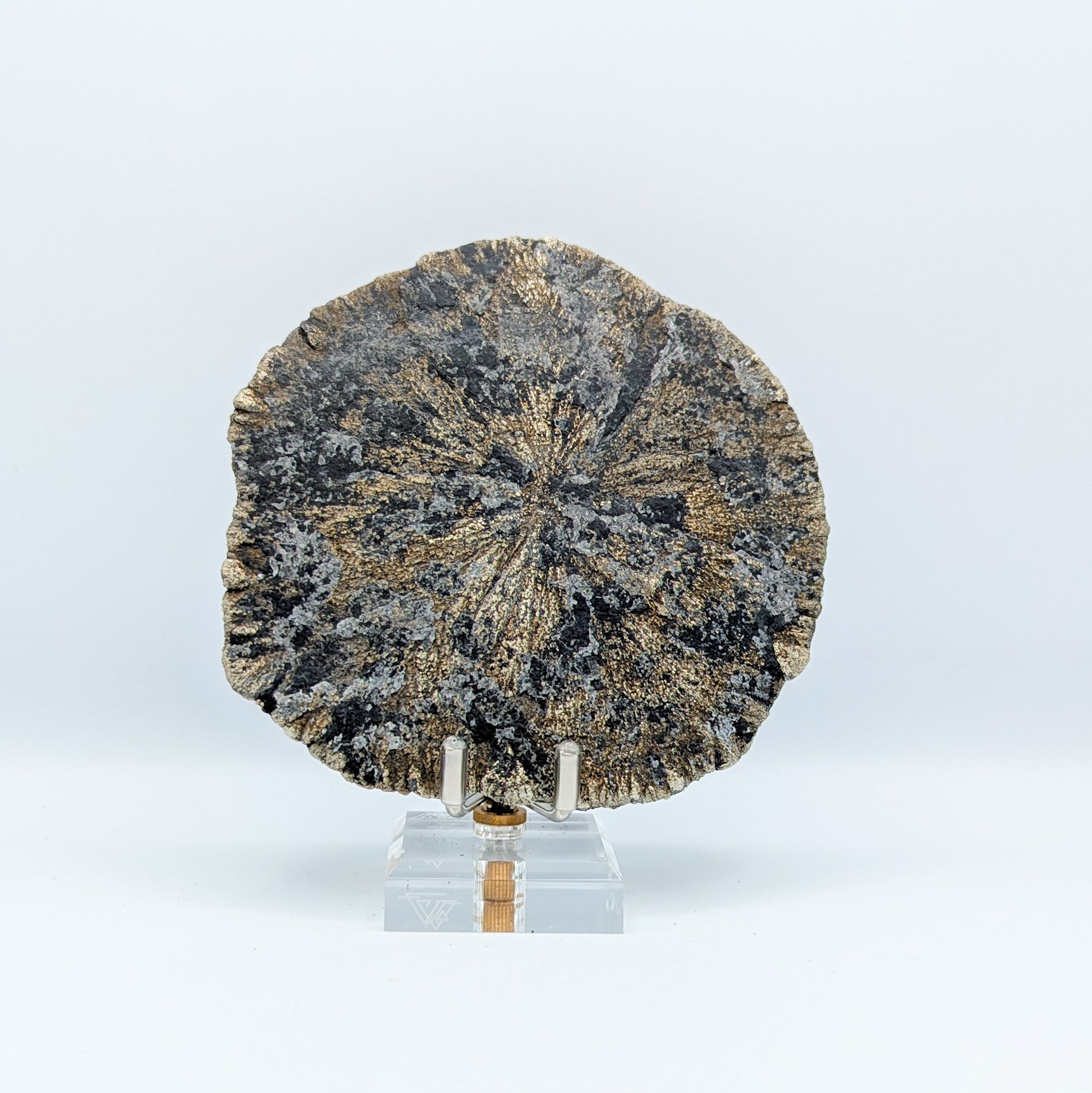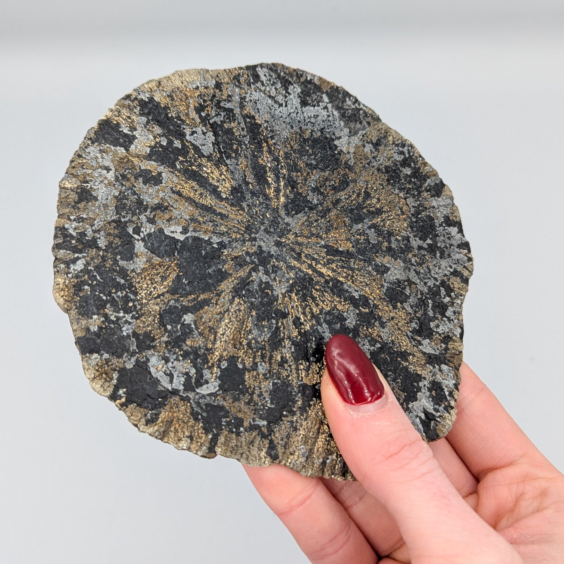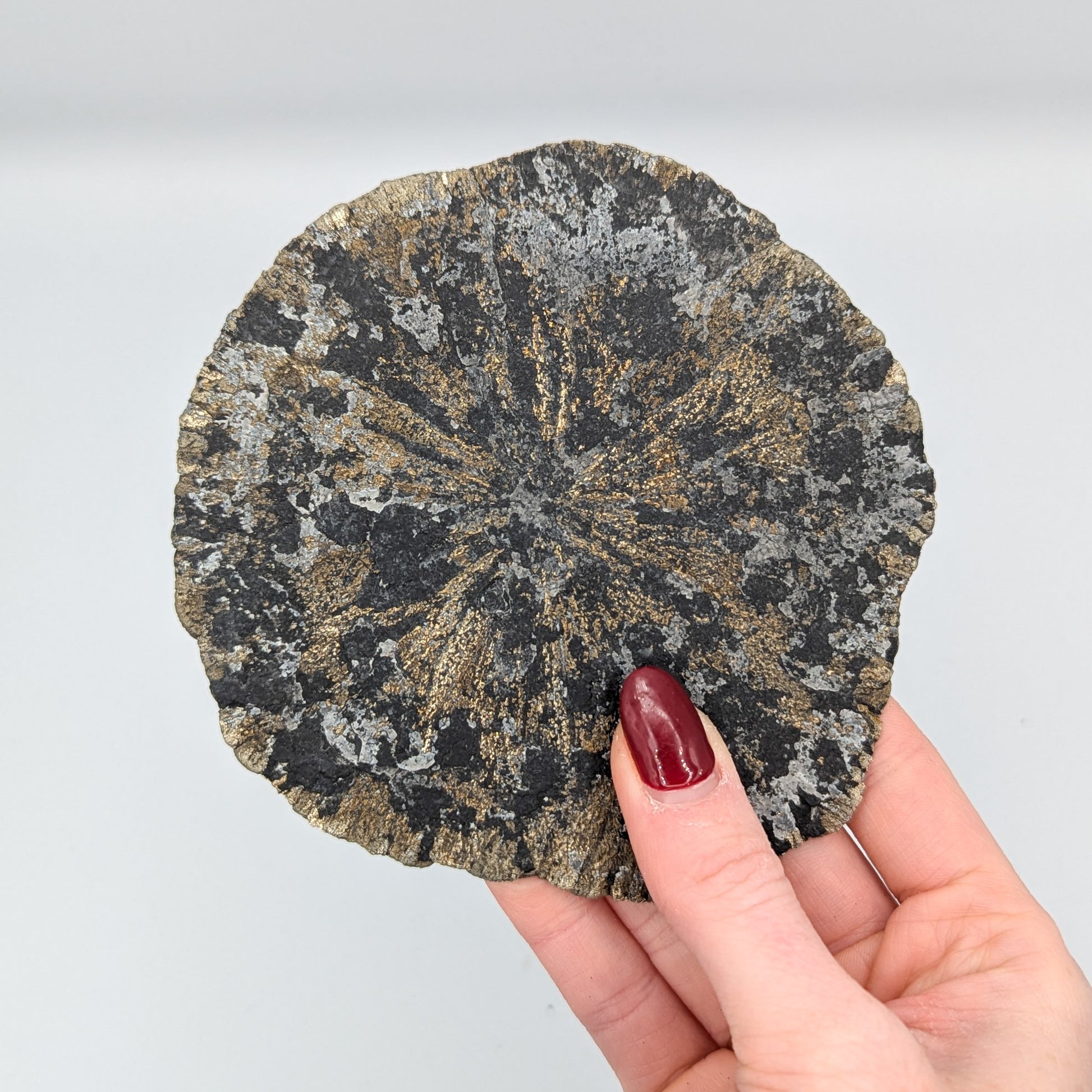 Pyrite Suns are a crystal structure that formed deep underground under enormous pressure about 350 million years ago. It is common to find these mineral disks about 300 feet below ground between seams of coal when coal is mined.