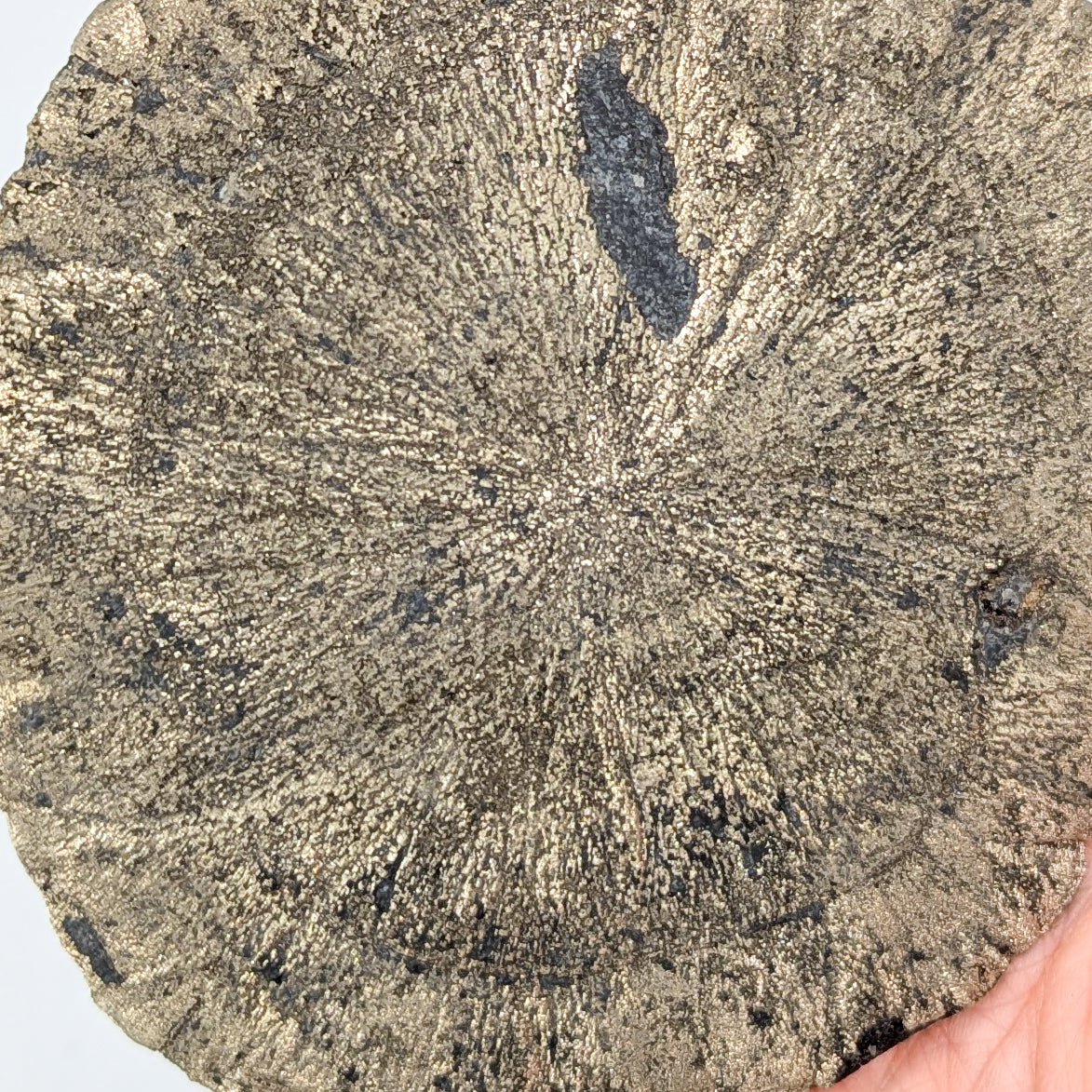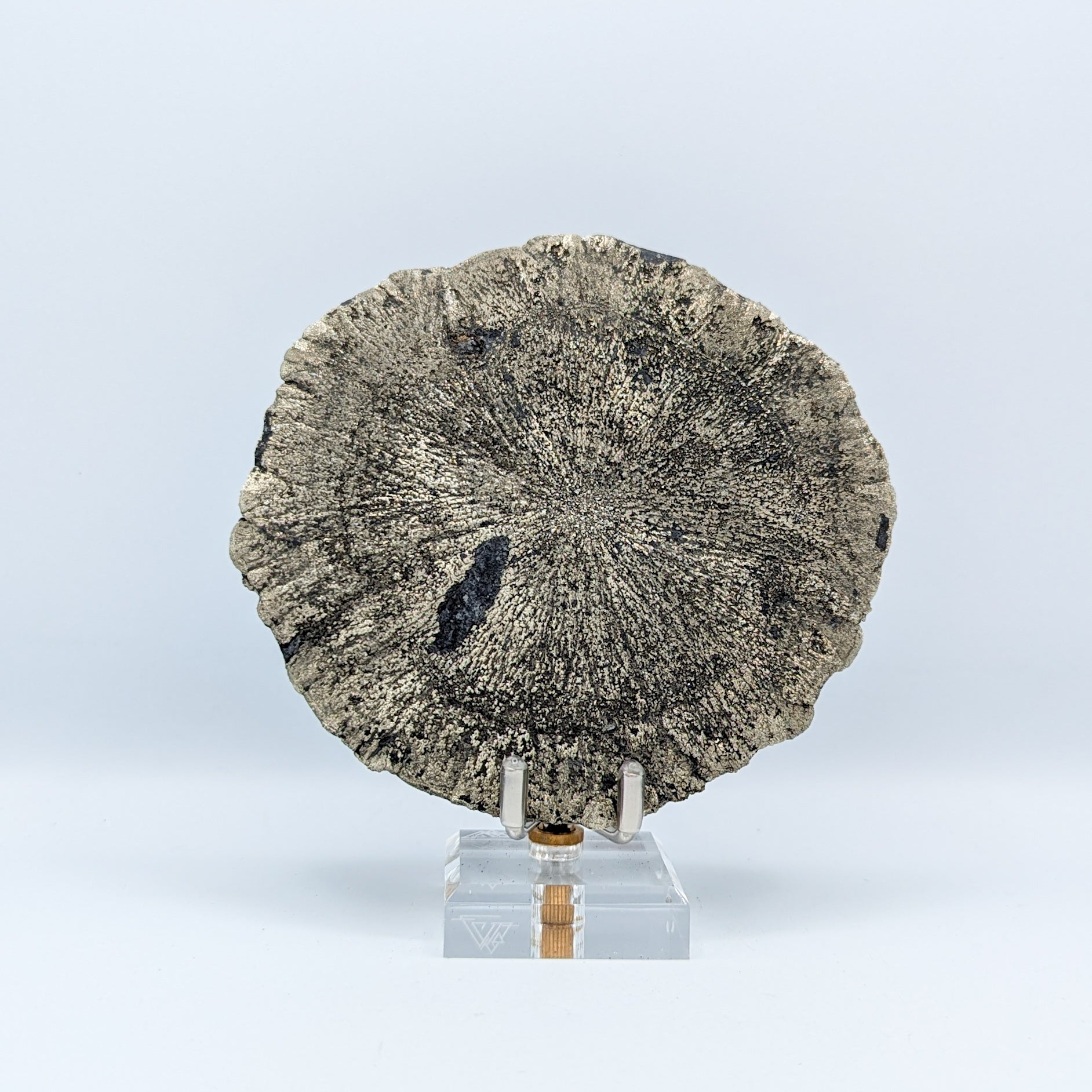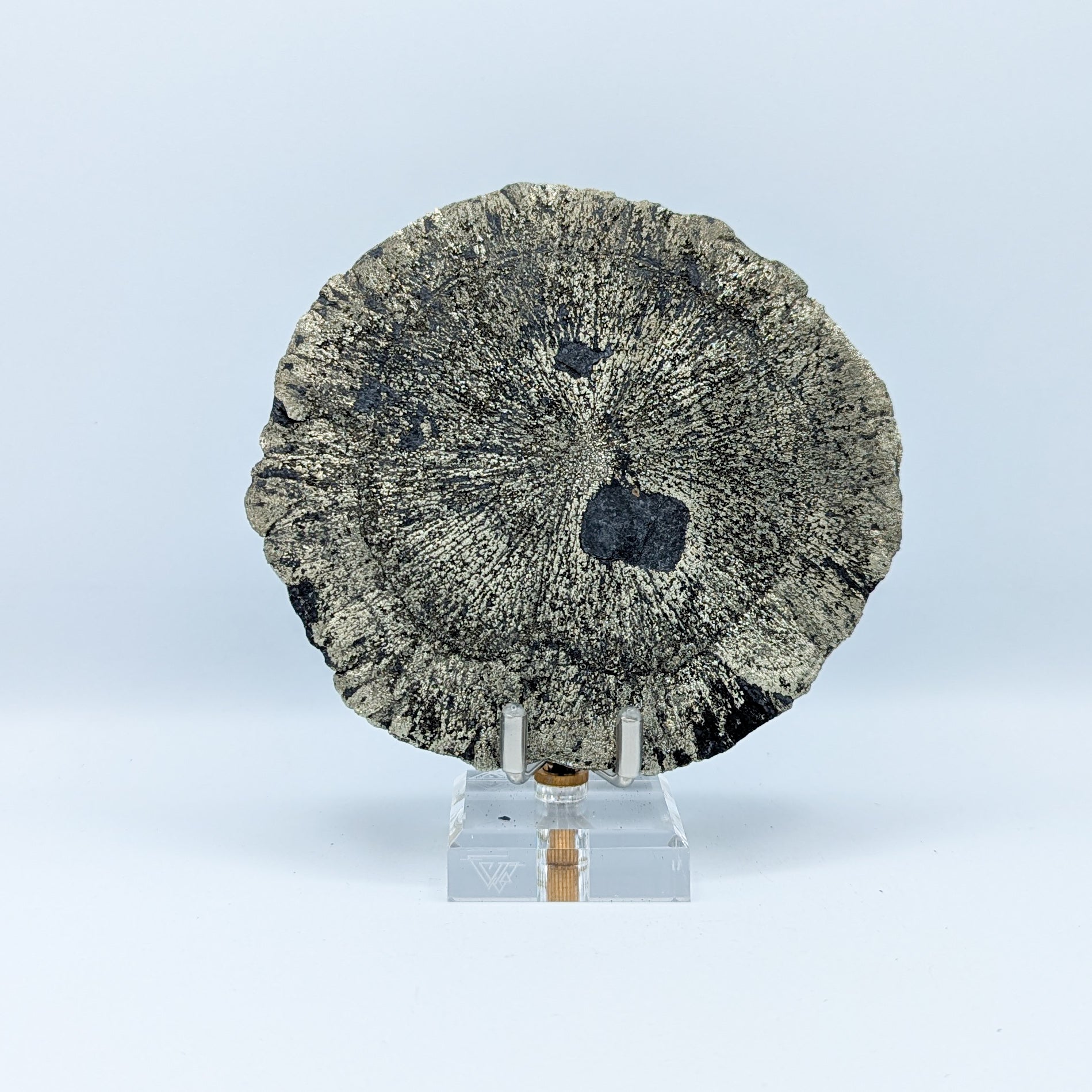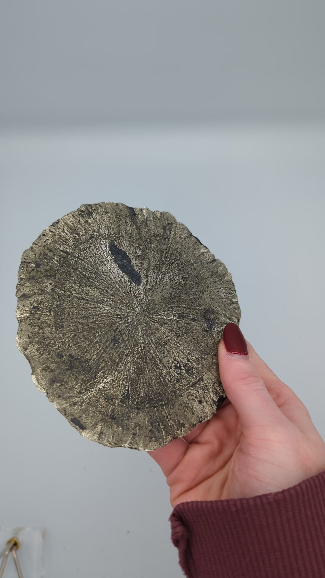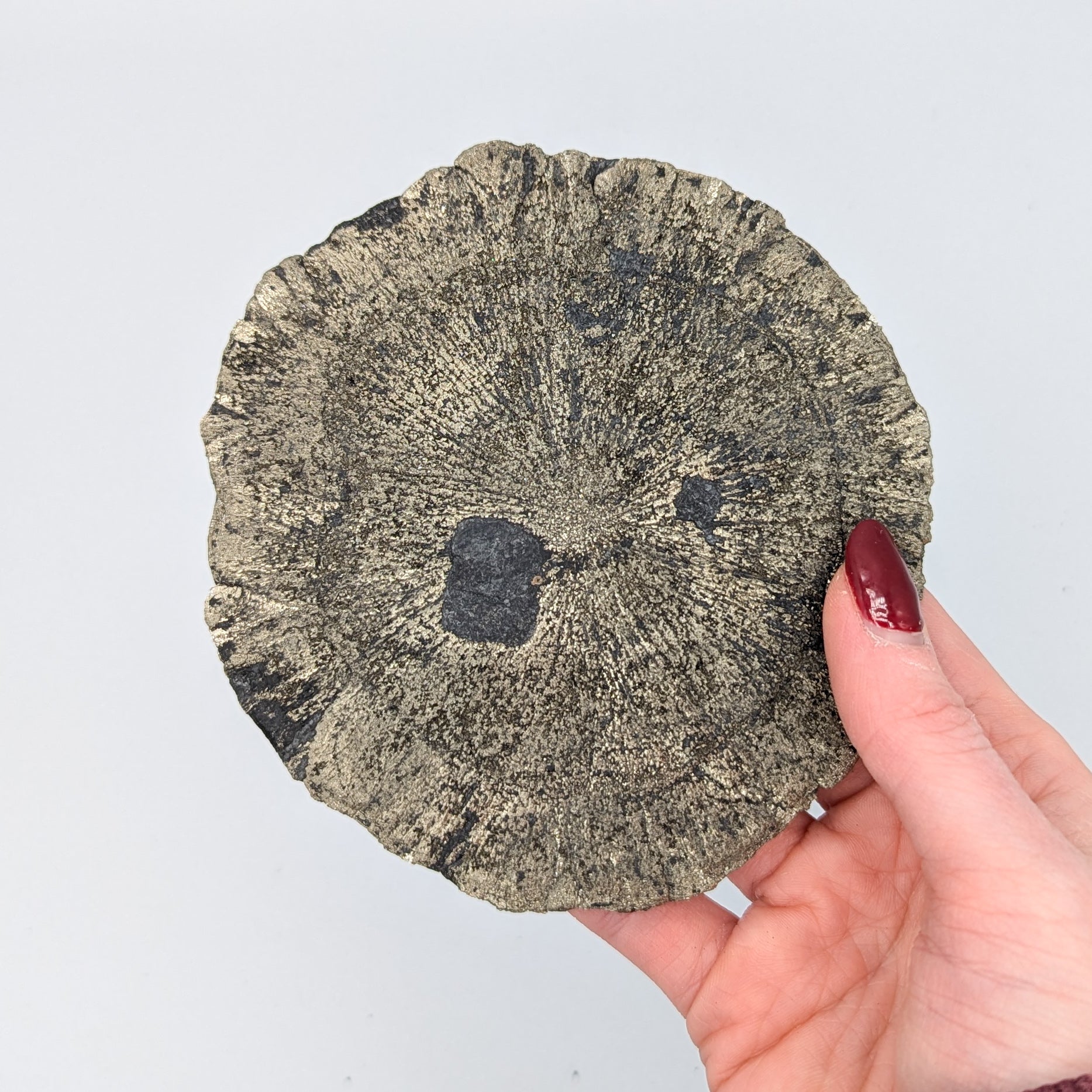 Pyrite Suns are a crystal structure that formed deep underground under enormous pressure about 350 million years ago. It is common to find these mineral disks about 300 feet below ground between seams of coal when coal is mined.